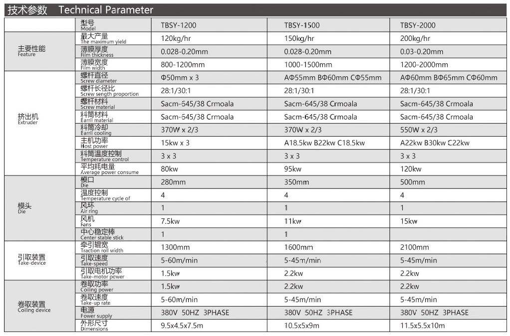機器特性 吹制各種規格的低密度聚乙烯、高密度聚乙烯和線性低密度聚乙烯塑料薄膜,廣泛應用于食品百貨、日用、化工 針紡品、購物禮袋和工業包裝。機筒、螺桿采用38CrMOAI合金材料經氨化處理精密加工而
